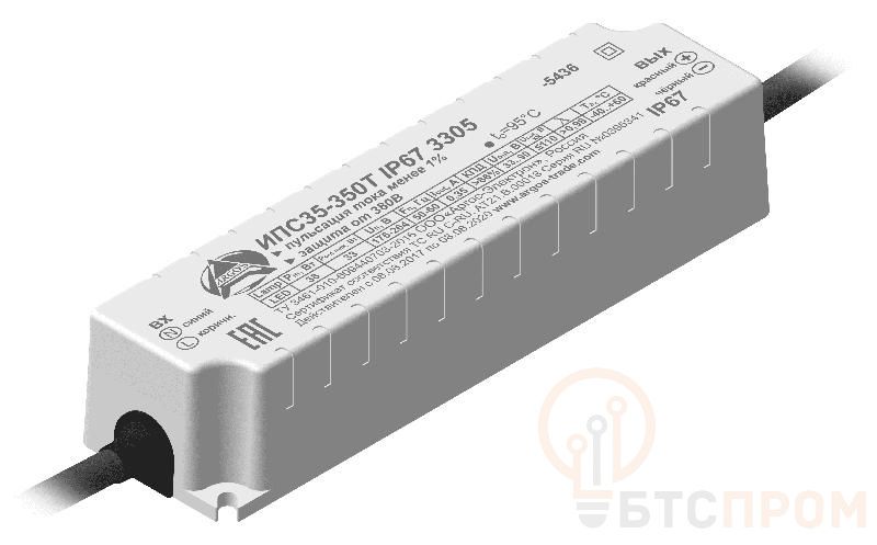Источник питания светодиодов (ИПС) применяется для питания светодиодных линеек, рассчитанных на работу в режиме постоянного тока. Защита от КЗ и ХХ, PF 0,95 , КПД, %, не менее 86.0, соответствие ЭМС в диапазоне от 9 кГц до 30МГц, стойкость к микросекундным импульсам большой энергии 4 кВ (L-N), гальваническая изоляция, пульсации <1% При подаче на вход драйвера напряжения более 300 В AC драйвер переходит в прерывистый режим работы с последующим отключением. Нормальный режим работы восстанавливается автоматически при уменьшении напряжения питания. Предельное значение входного напряжения составляет 420 В АС. Светодиоды при срабатывании такой защиты кратковременно погасают, мигая с частотой 100 Гц. При величине нормального напряжения светодиоды автоматически переходят в режим стабильного освещения.