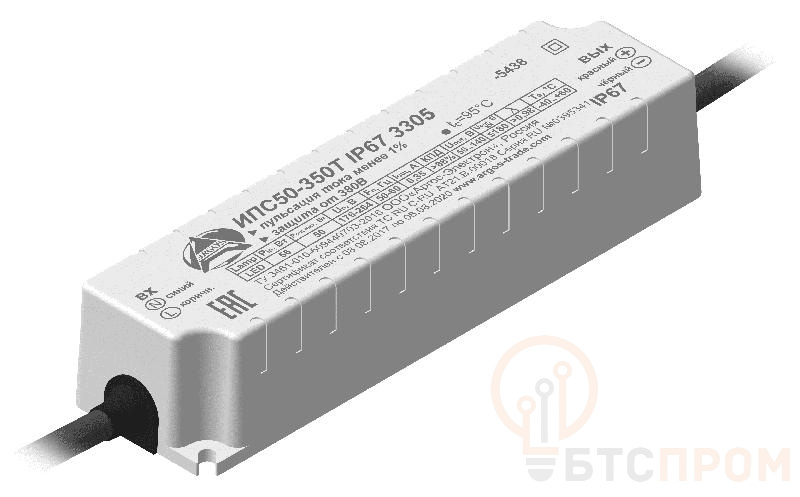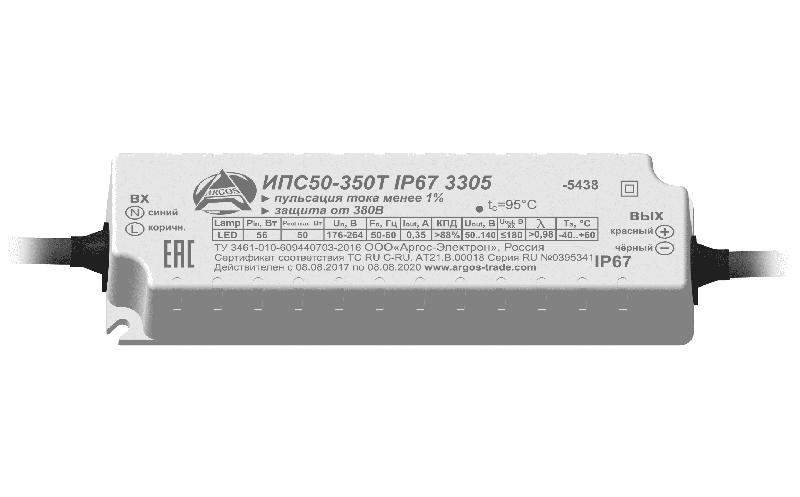 Источник питания светодиодов (ИПС) применяется для питания светодиодных линеек, рассчитанных на работу в режиме постоянного тока. Защита от КЗ и ХХ, PF 0,95 , КПД, %, не менее 90.0, соответствие ЭМС в диапазоне от 9 кГц до 30МГц, стойкость к микросекундным импульсам большой энергии 4 кВ (L-N), гальваническая изоляция, пульсации <1% При подаче на вход драйвера напряжения более 300 В AC драйвер переходит в прерывистый режим работы с последующим отключением. Нормальный режим работы восстанавливается автоматически при уменьшении напряжения питания. Предельное значение входного напряжения составляет 420 В АС. Светодиоды при срабатывании такой защиты кратковременно погасают, мигая с частотой 100 Гц. При величине нормального напряжения светодиоды автоматически переходят в режим стабильного освещения.
