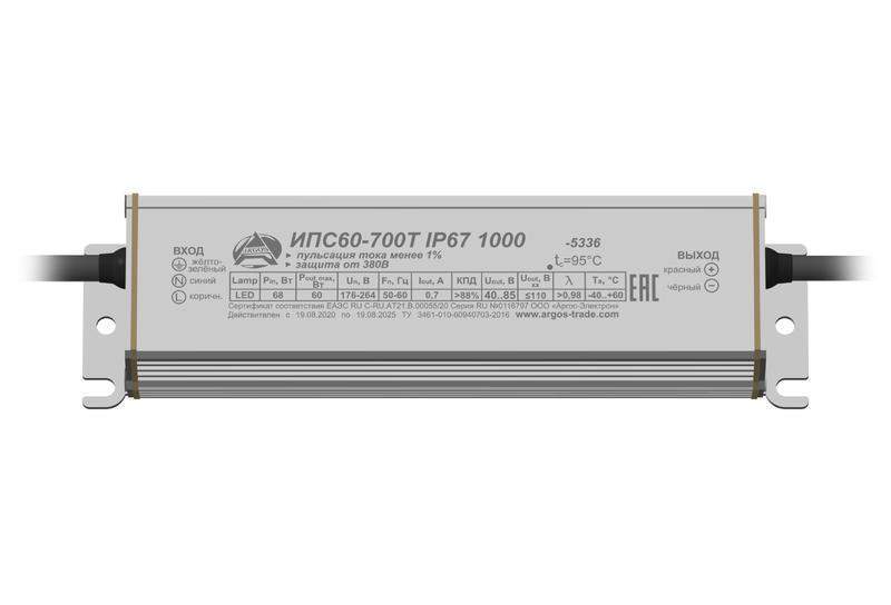 Источник питания светодиодов (ИПС) применяется для питания светодиодных линеек, рассчитанных на работу в режиме постоянного тока. Защита от КЗ и ХХ, PF 0,95 , КПД, %, не менее 90.0, соответствие ЭМС в диапазоне от 9 кГц до 30МГц, стойкость к микросекундным импульсам большой энергии 4 кВ (L-N), 6 кВ (L-PE, N-PE), гальваническая изоляция, пульсации <1%. При подаче на вход драйвера напряжения более 300 В AC драйвер переходит в прерывистый режим работы с последующим отключением. Нормальный режим работы восстанавливается автоматически при уменьшении напряжения питания. Предельное значение входного напряжения составляет 420 В АС. Светодиоды при срабатывании такой защиты кратковременно погасают, мигая с частотой 100 Гц. При нормализации напряжения светодиоды автоматически переходят в режим стабильной работы. Наличие грозозащиты и термозащиты от перегрева драйвера. При превышении температуры корпуса выше (+75 С) драйвер выключается, после стабилизации температуры переходит в обычный режим работы
