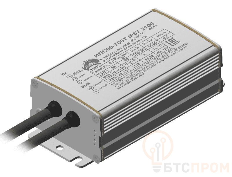 Источник питания светодиодов (ИПС) применяется для питания светодиодных линеек, рассчитанных на работу в режиме постоянного тока. Защита от КЗ и ХХ, PF 0,95 , КПД, %, не менее 89.0, соответствие ЭМС в диапазоне от 9 кГц до 30МГц, стойкость к микросекундным импульсам большой энергии 4 кВ (L-N), 6 кВ (L-PE, N-PE), гальваническая изоляция, пульсации <1%. При подаче на вход драйвера напряжения более 300 В AC драйвер переходит в прерывистый режим работы с последующим отключением. Нормальный режим работы восстанавливается автоматически при уменьшении напряжения питания. Предельное значение входного напряжения составляет 420 В АС. Светодиоды при срабатывании такой защиты кратковременно погасают, мигая с частотой 100 Гц. При нормализации напряжения светодиоды автоматически переходят в режим стабильной работы. Наличие грозозащиты