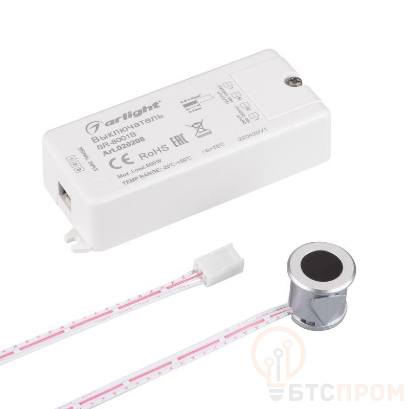 Бесконтактный ИК-выключатель ламп и освещения 220 В (серебристый сенсор в комплекте). Для дверей, расстояние от 1 до 6 см, датчик открыт — «вкл», закрыт — «выкл». Макс. мощность 500 Вт, AC 100-240 В. Габаритные размеры: блок 82?33?20 мм, датчик 20?20 мм, посадочное отверстие 18 мм, кабель 1.5 м.