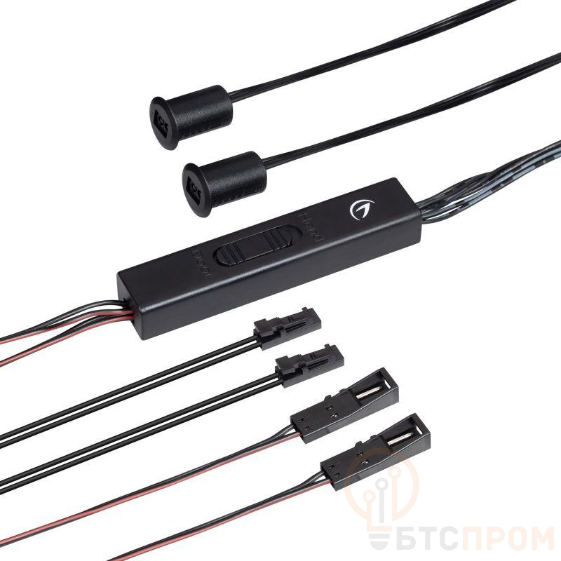 Выключатель для светодиодной ленты 12-24 В. В комплекте 2 датчика. Питание/рабочее напряжение DC 12-24 В, максимальный ток 4 A на канал, 1 канал, максимальная мощность 48-96 Вт. Реагирует на открывание дверей или движение рукой, переключатель между режимами «hand» - «door» расположен на корпусе блока управления. Расстояние срабатывания до 10 см, датчик открыт — «вкл», закрыт — «выкл». Габаритные размеры блока управления: 75 х 15 х 11 мм, кабель 1 м (у датчика), кабель 25 см (питание). Габаритные размеры датчика: 11 х 18 мм, врезное отверстие O 11 мм.