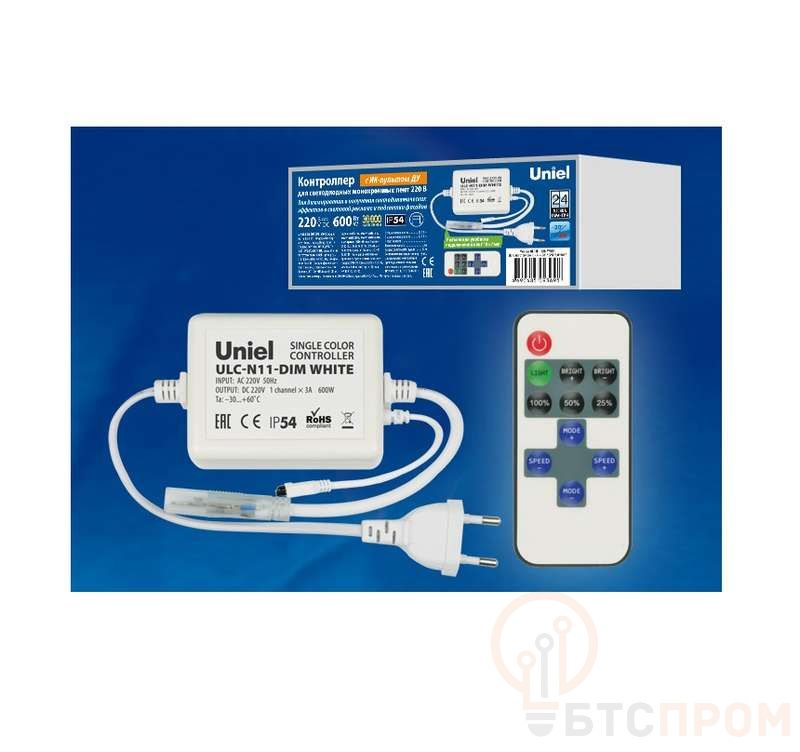 Контроллер ULC-N11-DIM WHITE для управления светодиод. одноцветными ULS-2835 лентами 220В 1 вых. 600Вт с пультом ДУ ИК Uniel UL-00002277
