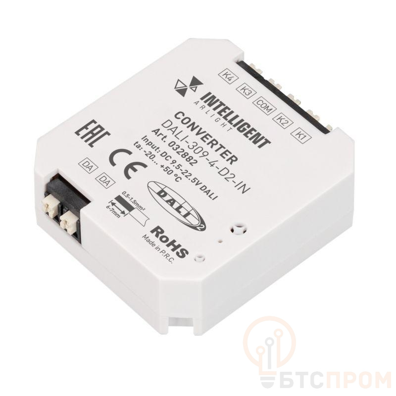Миниатюрный встраиваемый конвертер DALI-2 для внешних кнопок, выключателей. Питание по шине DALI, 2.7mA, выход - сигнал DALI-2. входы кнопок свободного функционала. Назначение кнопок задается в мастер-контроллере серии DALI-LOGIC-x. 50х43х15мм