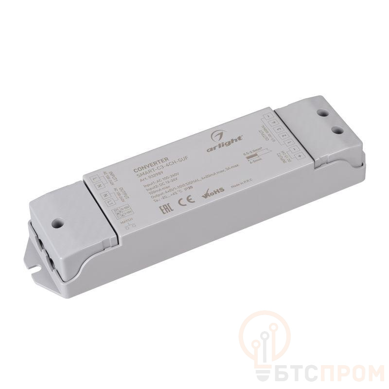 Конвертер RF сигнала от пультов серии SMART в сигнал 0/1-10V (выбор переключателем на корпусе). Питание AC230V, выходное напряжение DC12-24V, выходной сигнал 0/1-10V, нагрузочная способность 20mA/канал, 4 канала. Корпус - PVC. Габариты 175х45х27 мм.