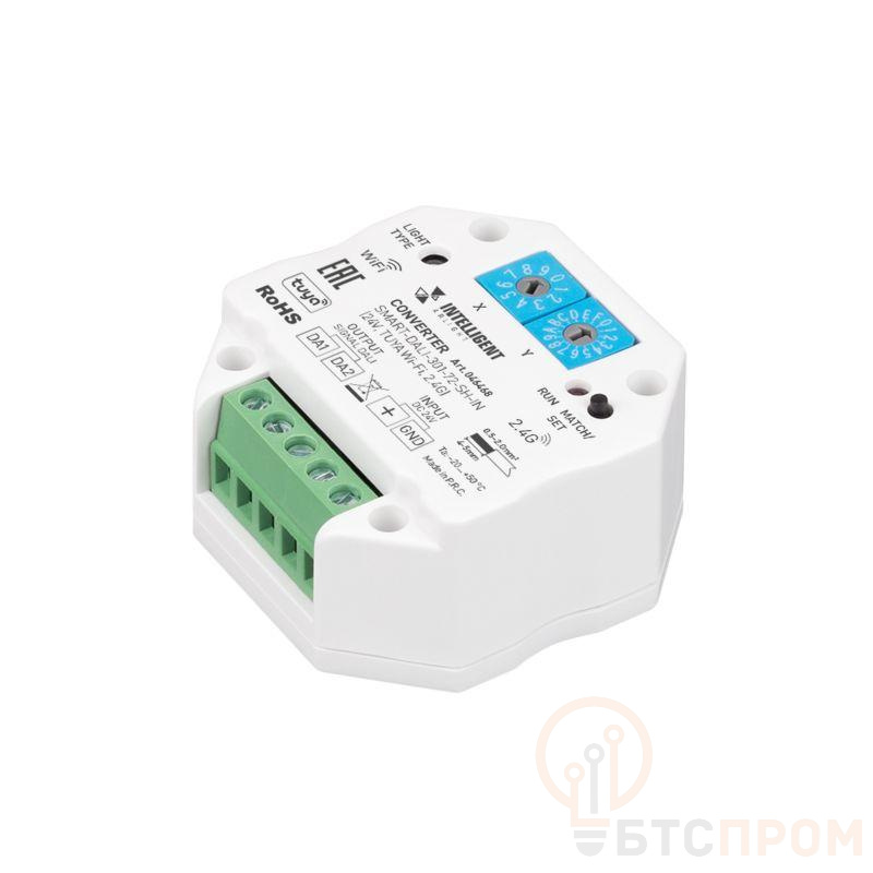 Конвертер Wi-Fi (TUYA) сигнала и RF сигнала серии SMART в DALI для DIM/MIX/RGB/RGBW/RGB-MIX источников света. Управляется при помощи Яндекс.Алисы. Питание DC24V, выходной сигнал DALI. Корпус - PVC. Габариты 52х52х27 мм. Совместим с пультами и панелями SMART.