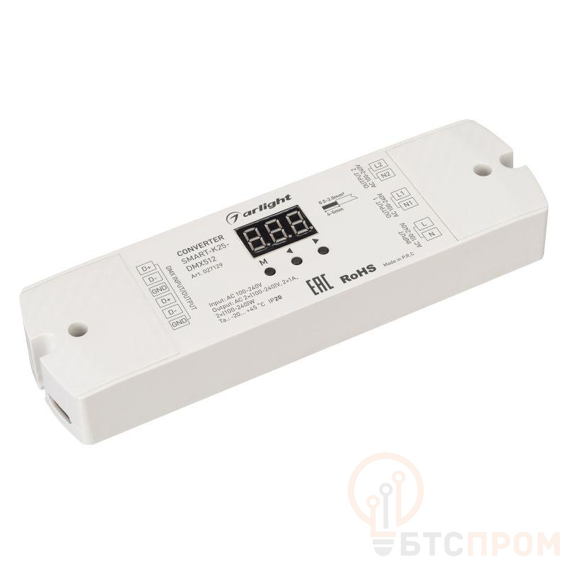 Конвертер сигнала DMX512 в TRIAC. Вход - DMX512, выход TRIAC(230V), напряжение питания AC 230V. 2 канала управления, ток нагрузки 2х1А. На корпусе цифровой дисплей. Габариты 170x50x23 мм.