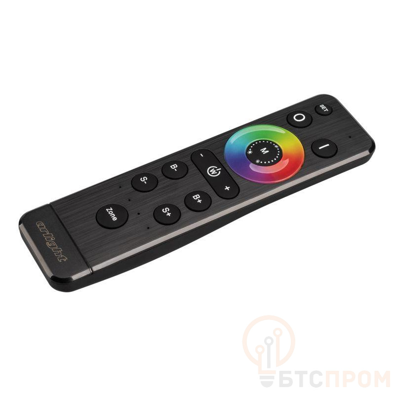 Кнопочный радиопульт с сенсорным кольцом 2.4 ГГц черного цвета для управления RGBW источниками света. 4 зоны управления. Питание 3VDC (AAA*2). Габариты 150х40х20мм. В комплекте настенное крепление.