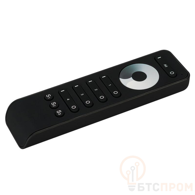 Кнопочный радиопульт с сенсорным кольцом 2.4 ГГц черного цвета для управления одноцветным (DIM) источником света. 4 зоны управления, 3 слота памяти пользовательских настроек, управление яркостью с помощью сенсорного кольца. Питание 3VDC (AAA*2). Габариты 155x43x17.5 мм. Изготовлен из пластика с покрытием Soft Touch. Управляет диммерами серии SMART (поставляются отдельно).