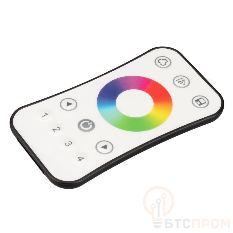 Кнопочный радиопульт с сенсорным кольцом 2.4 ГГц белого цвета для управления RGB источником света. 4 зоны управления, выбор цвета с помощью сенсорного кольца. Питание 3VDC (CR2032). Габариты 107x58.5x9 мм. Изготовлен из пластика с покрытием, защищающим от загрязнения. Управляет контроллерами и панелями серии SMART (поставляются отдельно).