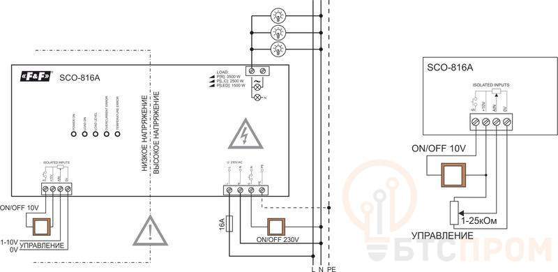 Регулятор освещенности серии "SCO" Монтаж на DIN-рейку. Для регулировки уровня яркости ламп накаливания, галогенных, светодиодных, компактных люминесцентных и других с функцией диммирования. Может применяться для работы с низковольтными галогеновыми лампами, включенными через тороидальный трансформатор, поддерживающий функцию диммирования. Включение и отключение освещения происходит после короткого нажатия кнопки, подключенной ко входу правления ON/OFF (ВКЛ/ВЫКЛ) S. Уровень яркости изменяется длительным нажатием кнопки. Одно длительное нажатие изменяет уровень освещенности до достижения максимального значения, другое длительное нажатие изменяет уровень освещенности пока не будет достигнуто минимальное значение. Включение света путем кратковременного нажатия кнопки восстанавливает ранее установленный уровень яркости. Память состояния сохраняется до тех пор, пока питание не будет отключено. После повторного включения питания уровень яркости выходит на значение 100%. Особенности: функция плавного включения и отключения освещения (Soft Start); термическая защита; контроль перегрузки по току; встроенным предохранителем на 20A; возможностью подключения кнопки ON/OFF (ВКЛ/ВЫКЛ), управляемой сетевым напряжением 230В AC или постоянным напряжением DC. напряжение питания 230 В AC; максимальная мощность ламп 3500 В.