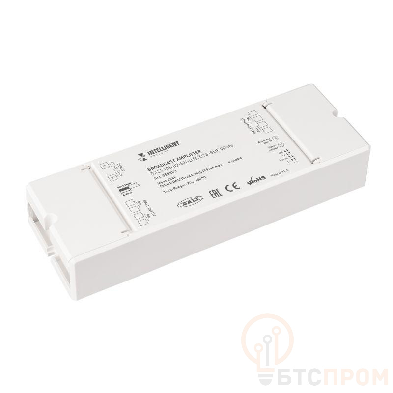 Усилитель-ретранслятор для одного адреса DALI. На входе шина DALI и один адрес DT8 для управления MIX источниками света, на выходе новая линия с широковещательным управлением. Питание 230В, выход 16В@150mA (шина DALI). Применимо для больших проектов, где используется один адрес для синхронного управления большим количеством балластов/драйверов. Dip переключателями возможен выбор различных режимов работы (см.даташит).