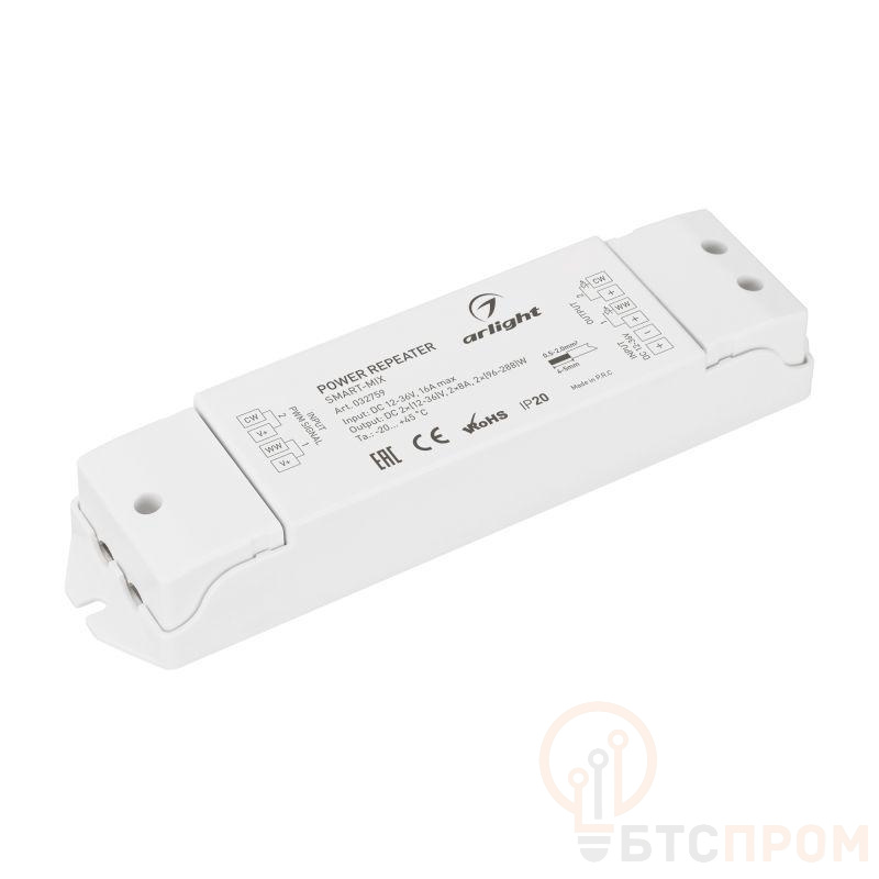 Двухканальный усилитель для контроллеров SMART-MIX (12-36V). Питание 12-36V. 2 канала, ток нагрузки 2x8A, мощность нагрузки 192-576W. Размер 175x45x27 мм.