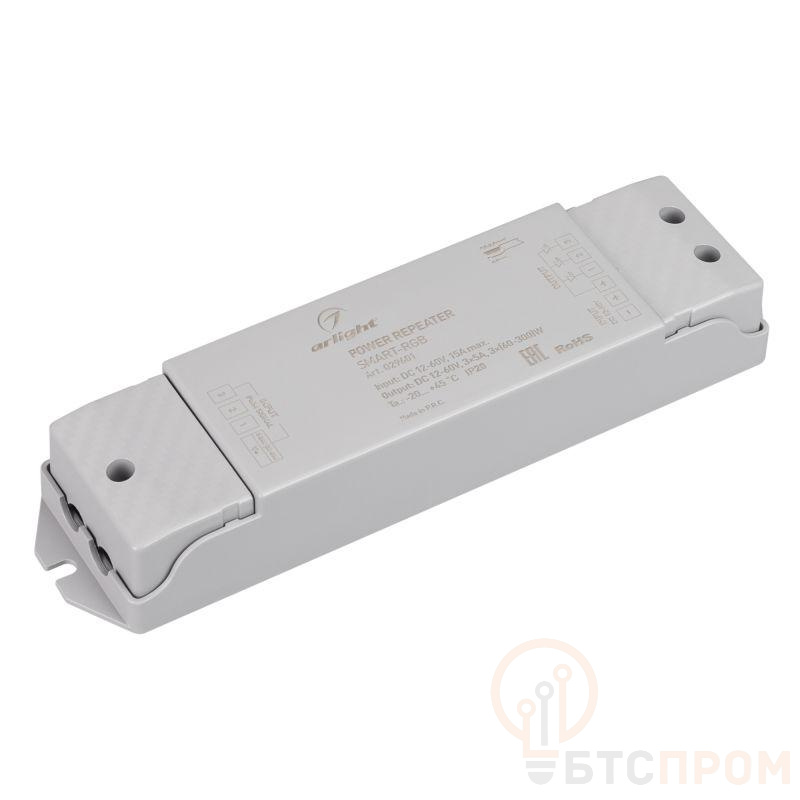 RGB-усилитель. Питание 12-60VDC. 3 канала, ток нагрузки 3x5A, мощность нагрузки 216-1080W. Размер 175x45x27 мм.