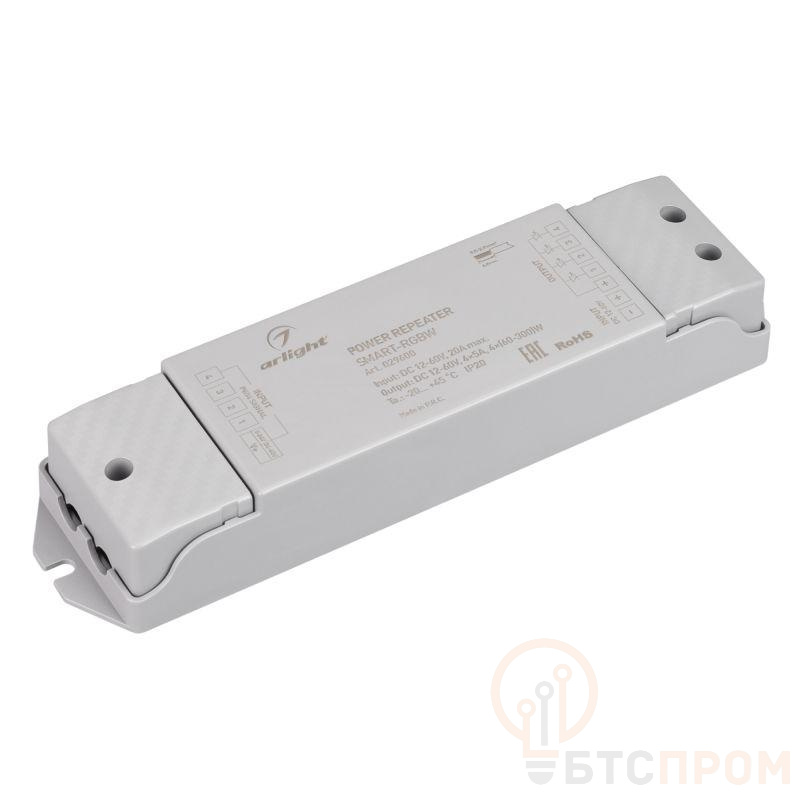 RGBW-усилитель. Питание 12-60VDC. 4 канала, ток нагрузки 4x5A, мощность нагрузки 240-1200W. Размер 175x45x27 мм.