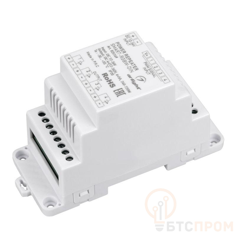 RGBW-усилитель для установки на DIN-рейку. Питание 12-36VDC. 4 канала, ток нагрузки 4x5A, мощность нагрузки 240-720W. Размер 115x48x67 мм.