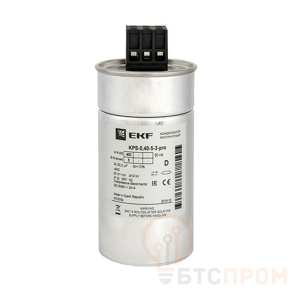Конденсатор косинусный КПС-0.4-5-3 PRO от EKF – современное и надежное решение для компенсации реактивной мощности в низковольтных сетях переменного тока частотой 50 Гц. Модель обладает номинальной мощностью 5.0 кВАр при напряжении 400 В. Конденсатор предназначен для повышения коэффициента мощности (cos φ), что позволяет значительно снизить потери электроэнергии, уменьшить нагрузку на кабельные линии и трансформаторы, а также избежать штрафов за потребление реактивной мощности.