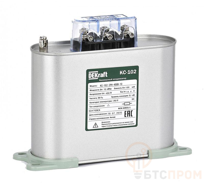 Косинусный однофазный конденсатор самовосстанавливающегося типа серий КС-102 предназначен для корректировки коэффициента мощности в электрических сетях переменного тока 50/60 Гц напряжением 400 В. Номинальная мощность 10 кВАр.