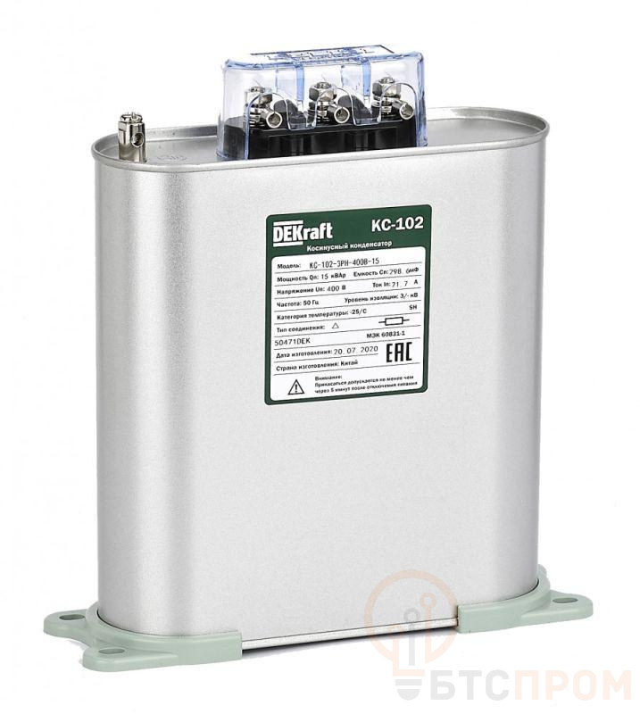 Косинусный трехфазый конденсатор самовосстанавливающегося типа серий КС-102 предназначен для корректировки коэффициента мощности в электрических сетях переменного тока 50/60 Гц напряжением 400 В. Номинальная мощность 15 кВАр.