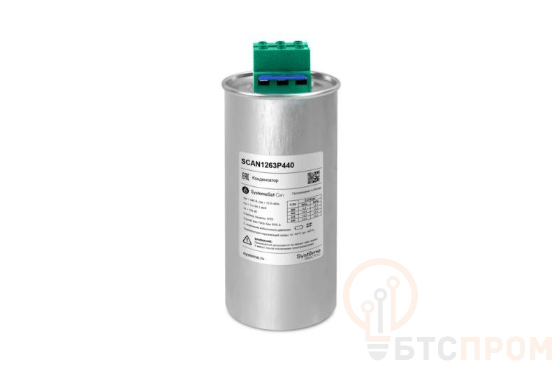 Низковольтный трёхфазный конденсатор торговой марки Systeme Electric серии SystemeSet типа Can предназначен для компенсации реактивной мощности. Силовой конденсатор представляет собой три однофазных конденсатора, собранных в единую конструкцию. В конденсаторах в качестве диэлектрика используется металлизированная полипропиленовая плёнка с функцией самовосстановления. В конструкцию конденсатора также входят: предохранитель с мембраной избыточного давления, клеммный блок с разрядным резистором. Корпус конденсатора выполнен из экструдированного алюминия. В качестве пропитки используется сухая биоразлагаемая смола без ПХБ, без SF6. Номинальная мощность 12,6 кВАр, номинальное напряжение 440В; температура окружающей среды от -40°C до +60°C; Ф95; длительно выдерживаемый ток 2In; максимальный пусковой ток 400In; степень защиты IP20.