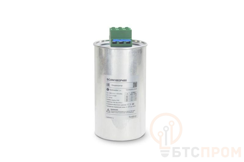 Низковольтный трёхфазный конденсатор торговой марки Systeme Electric серии SystemeSet типа Can предназначен для компенсации реактивной мощности. Силовой конденсатор представляет собой три однофазных конденсатора, собранных в единую конструкцию. В конденсаторах в качестве диэлектрика используется металлизированная полипропиленовая плёнка с функцией самовосстановления. В конструкцию конденсатора также входят: предохранитель с мембраной избыточного давления, клеммный блок с разрядным резистором. Корпус конденсатора выполнен из экструдированного алюминия. В качестве пропитки используется сухая биоразлагаемая смола без ПХБ, без SF6. Номинальная мощность 16,8 кВАр, номинальное напряжение 480В; температура окружающей среды от -40°C до +60°C; Ф116; длительно выдерживаемый ток 2In; максимальный пусковой ток 400In; степень защиты IP20.