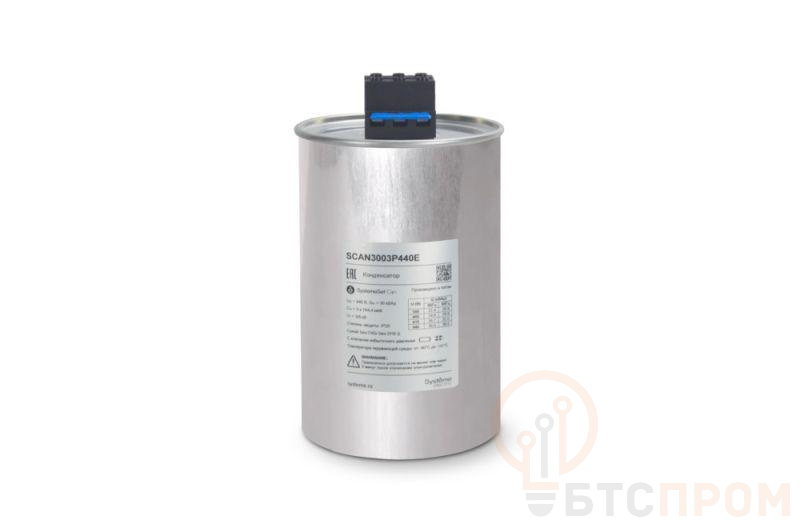 Низковольтный трёхфазный конденсатор торговой марки Systeme Electric серии SystemeSet типа Can предназначен для компенсации реактивной мощности. Силовой конденсатор представляет собой три однофазных конденсатора, собранных в единую конструкцию. В конденсаторах в качестве диэлектрика используется металлизированная полипропиленовая плёнка с функцией самовосстановления. В конструкцию конденсатора также входят: предохранитель с мембраной избыточного давления, клеммный блок с разрядным резистором. Корпус конденсатора выполнен из экструдированного алюминия. В качестве пропитки используется сухая биоразлагаемая смола без ПХБ, без SF6. Номинальная мощность 30 кВАр, номинальное напряжение 440В; температура окружающей среды от -40°C до +55°C; Ф136; длительно выдерживаемый ток 1,5In; максимальный пусковой ток 400In; степень защиты IP20.