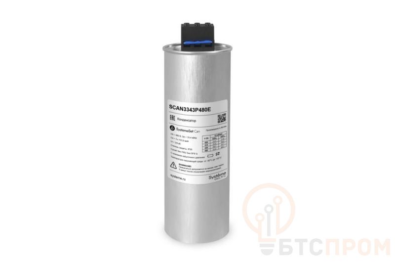 Низковольтный трёхфазный конденсатор торговой марки Systeme Electric серии SystemeSet типа Can предназначен для компенсации реактивной мощности. Силовой конденсатор представляет собой три однофазных конденсатора, собранных в единую конструкцию. В конденсаторах в качестве диэлектрика используется металлизированная полипропиленовая плёнка с функцией самовосстановления. В конструкцию конденсатора также входят: предохранитель с мембраной избыточного давления, клеммный блок с разрядным резистором. Корпус конденсатора выполнен из экструдированного алюминия. В качестве пропитки используется сухая биоразлагаемая смола без ПХБ, без SF6. Номинальная мощность 33,4 кВАр, номинальное напряжение 480В; температура окружающей среды от -40°C до +55°C; Ф95L; длительно выдерживаемый ток 1,5In; максимальный пусковой ток 400In; степень защиты IP20.