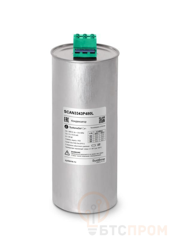 Низковольтный трёхфазный конденсатор торговой марки Systeme Electric серии SystemeSet типа Can предназначен для компенсации реактивной мощности. Силовой конденсатор представляет собой три однофазных конденсатора, собранных в единую конструкцию. В конденсаторах в качестве диэлектрика используется металлизированная полипропиленовая плёнка с функцией самовосстановления. В конструкцию конденсатора также входят: предохранитель с мембраной избыточного давления, клеммный блок с разрядным резистором. Корпус конденсатора выполнен из экструдированного алюминия. В качестве пропитки используется сухая биоразлагаемая смола без ПХБ, без SF6. Номинальная мощность 33,4 кВАр, номинальное напряжение 480В; температура окружающей среды от -40°C до +60°C; Ф116L; длительно выдерживаемый ток 2In; максимальный пусковой ток 400In; степень защиты IP20.