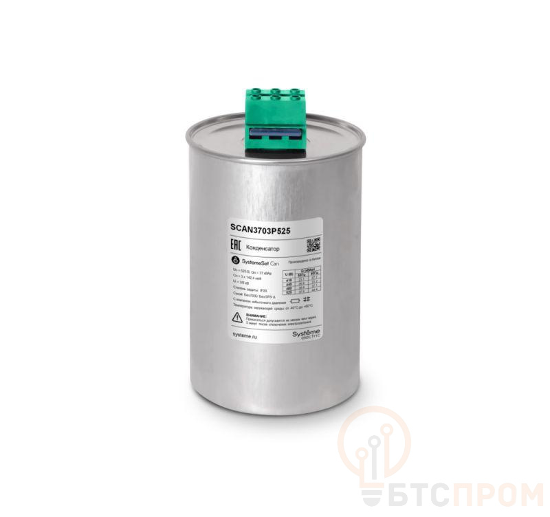 Низковольтный трёхфазный конденсатор торговой марки Systeme Electric серии SystemeSet типа Can предназначен для компенсации реактивной мощности. Силовой конденсатор представляет собой три однофазных конденсатора, собранных в единую конструкцию. В конденсаторах в качестве диэлектрика используется металлизированная полипропиленовая плёнка с функцией самовосстановления. В конструкцию конденсатора также входят: предохранитель с мембраной избыточного давления, клеммный блок с разрядным резистором. Корпус конденсатора выполнен из экструдированного алюминия. В качестве пропитки используется сухая биоразлагаемая смола без ПХБ, без SF6. Номинальная мощность 37 кВАр, номинальное напряжение 525В; температура окружающей среды от -40°C до +60°C; Ф136; длительно выдерживаемый ток 2In; максимальный пусковой ток 400In; степень защиты IP20.