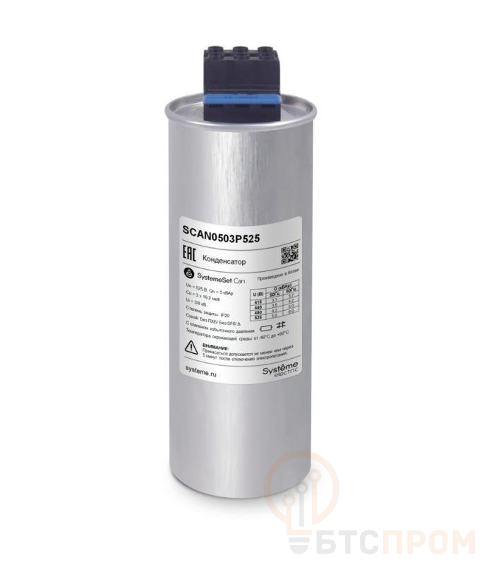Низковольтный трёхфазный конденсатор торговой марки Systeme Electric серии SystemeSet типа Can предназначен для компенсации реактивной мощности. Силовой конденсатор представляет собой три однофазных конденсатора, собранных в единую конструкцию. В конденсаторах в качестве диэлектрика используется металлизированная полипропиленовая плёнка с функцией самовосстановления. В конструкцию конденсатора также входят: предохранитель с мембраной избыточного давления, клеммный блок с разрядным резистором. Корпус конденсатора выполнен из экструдированного алюминия. В качестве пропитки используется сухая биоразлагаемая смола без ПХБ, без SF6. Номинальная мощность 5 кВАр, номинальное напряжение 525В; температура окружающей среды от -40°C до +60°C; Ф75; длительно выдерживаемый ток 2In; максимальный пусковой ток 400In; степень защиты IP20.