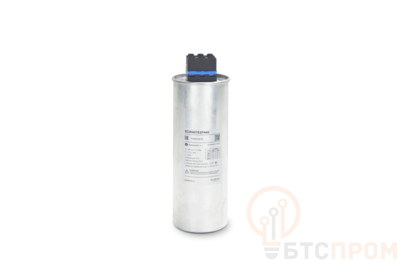 Низковольтный трёхфазный конденсатор торговой марки Systeme Electric серии SystemeSet типа Can предназначен для компенсации реактивной мощности. Силовой конденсатор представляет собой три однофазных конденсатора, собранных в единую конструкцию. В конденсаторах в качестве диэлектрика используется металлизированная полипропиленовая плёнка с функцией самовосстановления. В конструкцию конденсатора также входят: предохранитель с мембраной избыточного давления, клеммный блок с разрядным резистором. Корпус конденсатора выполнен из экструдированного алюминия. В качестве пропитки используется сухая биоразлагаемая смола без ПХБ, без SF6. Номинальная мощность 7,6 кВАр, номинальное напряжение 440В; температура окружающей среды от -40°C до +60°C; Ф75; длительно выдерживаемый ток 2In; максимальный пусковой ток 400In; степень защиты IP20.