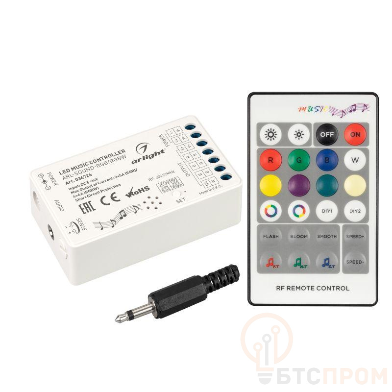 RGBW-АУДИО-контроллер с RF ДУ (24 кнопки), рег-ка яркости, цветности, скорости, 3 аудиорежима. Вход аудио из внешнего микрофона, регулировка усиления. Выход 12-24V 192-384W, 4х4A. Габариты контроллера 72х42х20 мм. Габариты пульта 48x82x5 мм. Вместо 023319.