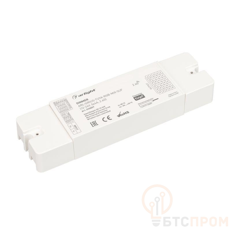 Универсальный 5-канальный для DIM/MIX/RGB/RGBW/RGB-MIX светодиодных лент. Питание/рабочее напряжение 12-24VDC, максимальный ток 4A на канал, 5 каналов, максимальная мощность 240-480W. Частота ШИМ 1.95kГц, Wi-Fi 2.4G. Синхронизация по радиосигналу между двумя контроллерами на расстояние до 10 метров. Винтовые клеммы. Корпус - PVC. Габариты 163х46х25 мм. Cовместим с платформой TUYA, поддерживается управление ЯНДЕКС АЛИСА. Список совместимых пультов в разделе "Совместимые".