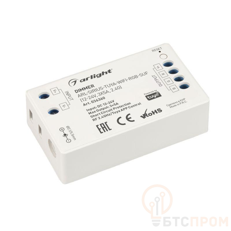 Диммер трёхканальный для RGB светодиодных лент. Питание/рабочее напряжение 12-24VDC, максимальный ток 5A на канал, 3 канала, максимальная мощность 180-360W. Частота ШИМ 1.95kГц, Wi-Fi 2.4G. Винтовые клеммы. Корпус - PVC. Габариты 70х40х20 мм. Cовместим с платформой TUYA. Список совместимых пультов в разделе "Совместимые".