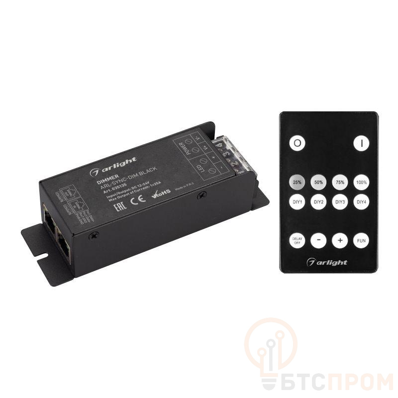 1-канальный диммер с радиопультом 14 кнопок. Питание 12-24VDC, макс.ток 1х25A, максимальная мощность 300-600W. Габариты диммера 127x42x32 мм, габариты пульта 85х51х6 мм. Синхронизация между несколькими контроллерами при подключении сетевым кабелем через разъем RJ45 (расстояние до 80 метров).