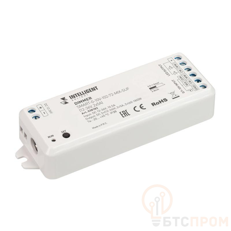 Диммер для мультибелых (MIX) источников света (0/1-10V). Питание/рабочее напряжение 12-36VDC, входной/выходной ток 5А на канал, 2 канала, выходная мощность 120-360W. Корпус - PVC. Габариты 114х38х20 мм.