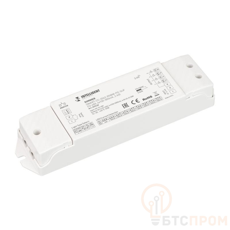 Контроллер тока RGBW для светодиодных RGBW светильников (ШИМ). Питание 12-48VDC, выходное 3-45 VDC напряжение , ток 150-500mA на канал, 4 канала, максимальная мощность 1.8W-90W. Ток и тип источника света устанавливаются dip-переключателями. Габариты 175х45х27 мм. Управляется пультами и панелями серии SMART (поставляются отдельно).