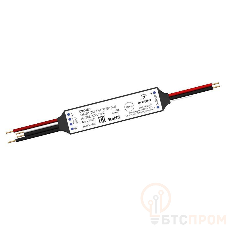 Миниатюрный диммер для монохромной светодиодной ленты (ШИМ). Питание/рабочее напряжение 12-24VDC, максимальный ток 3A на канал, 1 канал, максимальная мощность 36-72W. Поддерживает функцию Push-Dim. Габариты 60x14x6 мм. Совместим с пультами и панелями SMART, поддерживающими диммирование по радиоканалу. !!!Актуальная схема привязки пультов в инструкции на сайте!!!