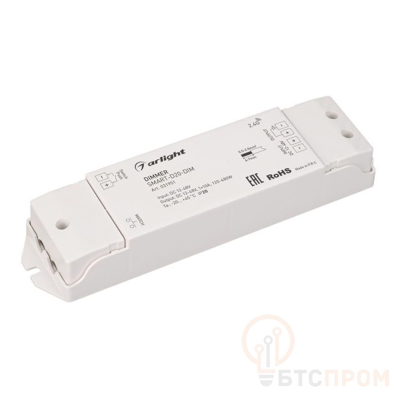 Диммер для монохромной светодиодной ленты (ШИМ). Питание/рабочее напряжение 12-48VDC, максимальный ток 10A на канал, 1 канал, максимальная мощность 120-480W. Винтовые клеммы. Корпус - PVC. Габариты 175x45x27 мм. Управляется пультами и панелями серии SMART (поставляются отдельно).