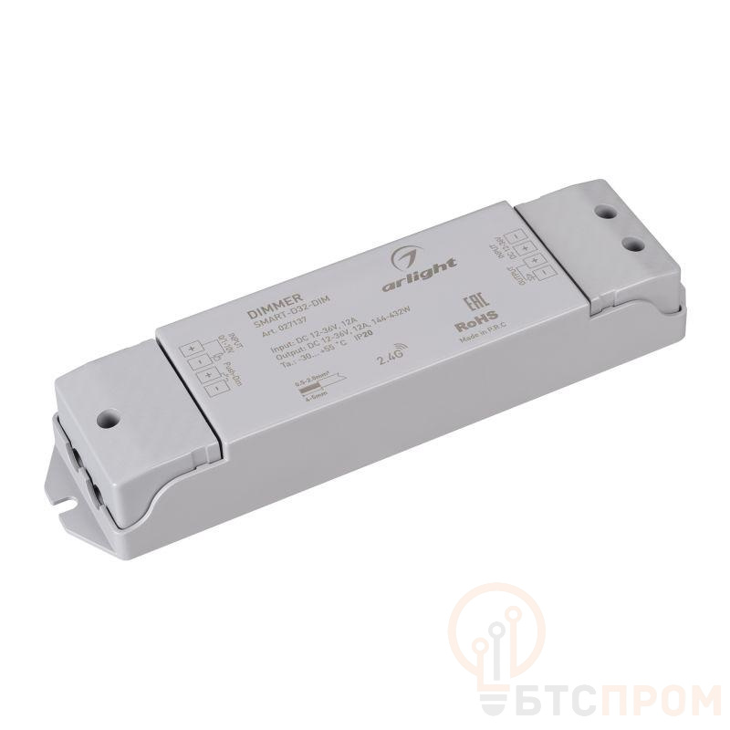 Диммер для одноцветных источников света (0/1-10V). Питание/рабочее напряжение 12-36VDC, входной/выходной ток 12А, выходная мощность 144-432W. Корпус - PVC. Габариты 175х45х27 мм. Наличие функции Push-Dim. Управляется 0/1-10V панелями серии SMART (поставляются отдельно).