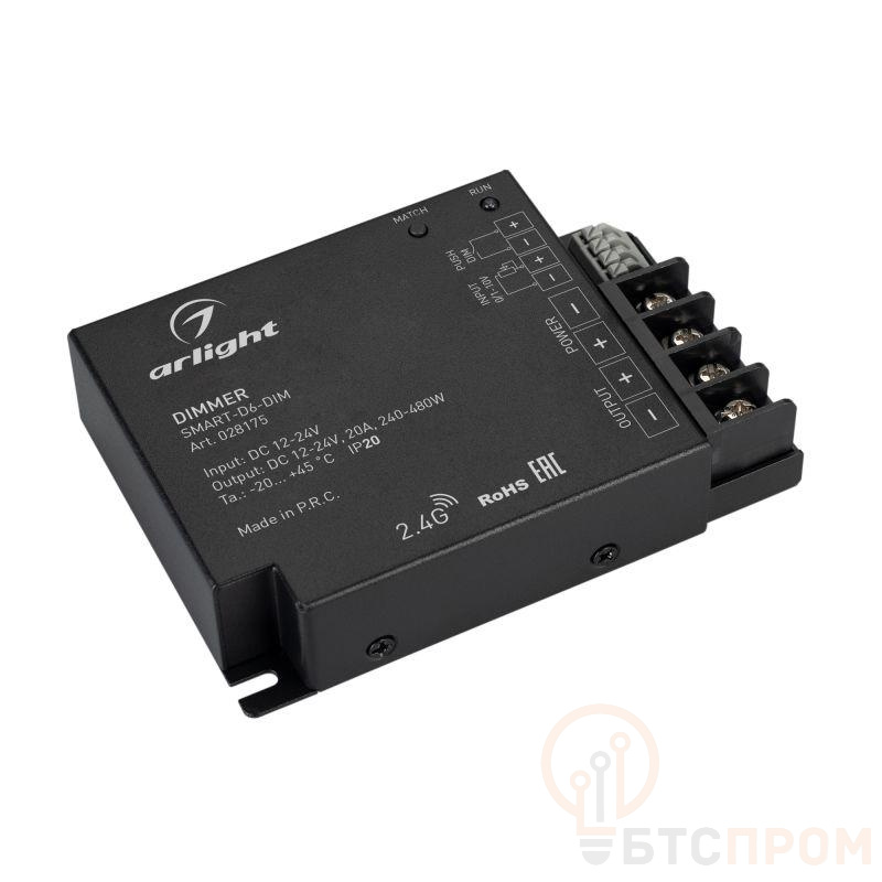 Диммер для монохромной светодиодной ленты (ШИМ). Входной сигнал: RF 2.4G, 0/1-10V, PUSH DIM. Питание/рабочее напряжение 12-24VDC, максимальный ток 20A на канал, 1 канал, максимальная мощность 240-480W. Винтовые клеммы, корпус - металл. Наличие функции Push-Dim. Габариты 107x75x25 мм. Управляется пультами и панелями серии SMART (поставляются отдельно).