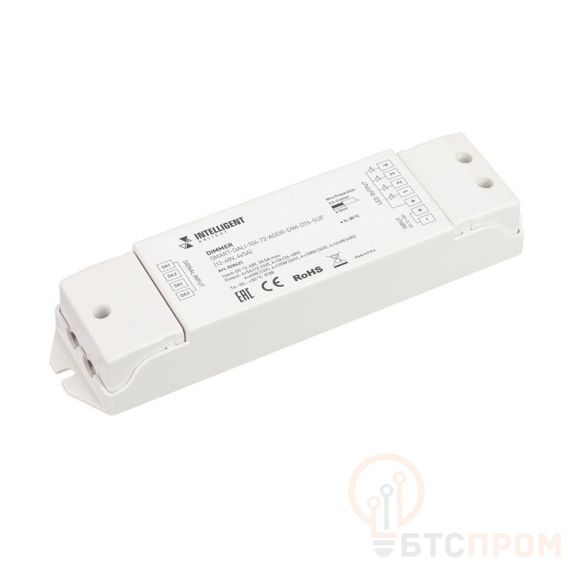 Диммер DALI (DT6) для одноцветных светодиодных лент. 4 адреса устройств, 4 канала управления. Питание/выход 12-48VDC, ток нагрузки 4x5A, максимальная суммарная мощность нагрузки 240-960W. Размер 175х45х27 мм.