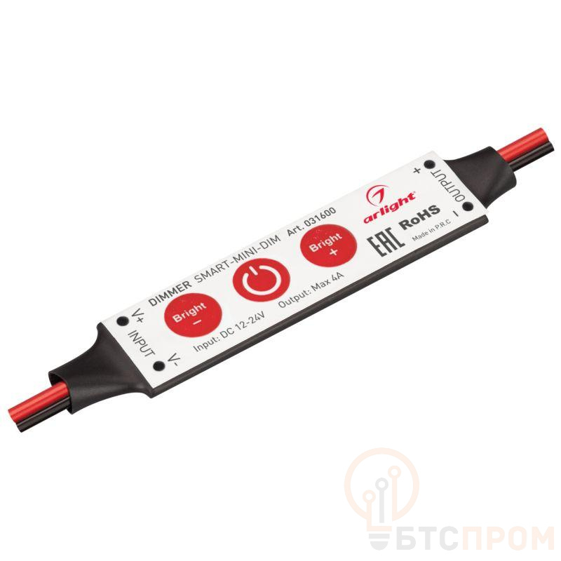 Миниатюрный диммер для монохромной светодиодной ленты (ШИМ). Питание/рабочее напряжение 12-24VDC, максимальный ток 4A на канал, 1 канал, максимальная мощность 49-96W. Габариты 60x12.5x5 мм. Управление кнопками на корпусе диммера.