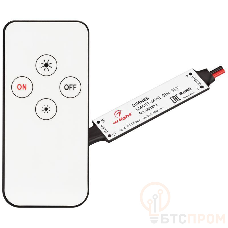 Комплект миниатюрного диммера с ИК-пультом для монохромной светодиодной ленты (ШИМ). Питание/рабочее напряжение 12-24VDC, максимальный ток 4A на канал, 1 канал, максимальная мощность 48-96W. Имеет память последнего состояния перед пропаданием электропитания. Габариты Диммера 74x13x5 мм (габариты провода 105x4x2 мм). Пульт 86х40х7 мм).