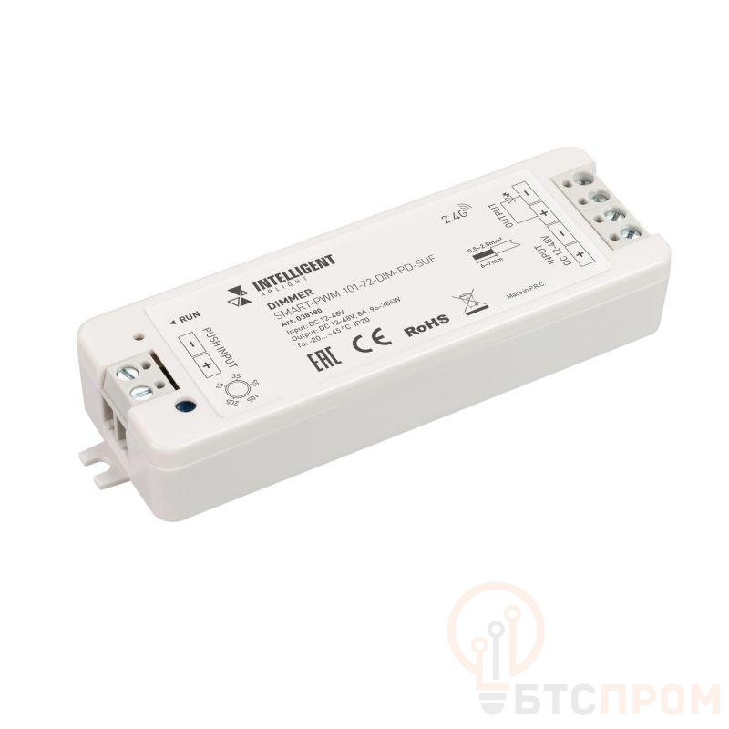 Диммер для монохромной светодиодной ленты (ШИМ). Питание/рабочее напряжение 12-48VDC, максимальный ток 8A на канал, 1 канал, максимальная мощность 96-384W, плавный старт (smooth start), функция Push-Dim. Винтовые клеммы. Корпус - PVC. Габариты 97x33x18 мм. Управляется пультами и панелями серии SMART (поставляются отдельно).