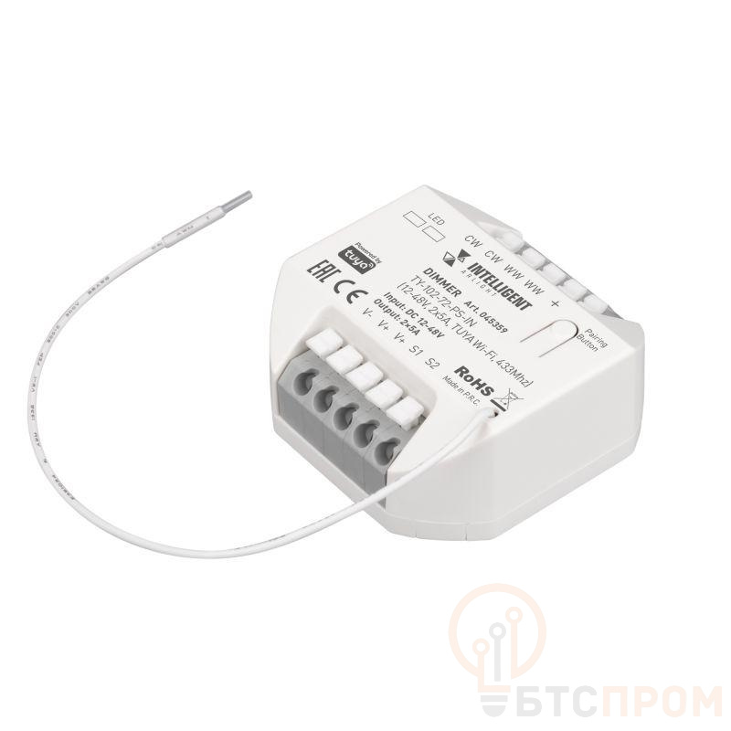 Универсальный 2-канальный диммер, предназначенный для управления одноцветными (DIM), двухцветными (MIX) светодиодными лентами и другими источниками света, поддерживающими диммирование ШИМ (PWM). Напряжение питания 12-48 В DC, максимальный ток нагрузки 5А на канал, 2 канала. Максимальная выходная мощность 120-480 Вт. Управление через WI-FI 2.4ГГц. Управление с помощью клавишных панелей RF 433кГц серии KINETIC. Совместим с платформой TUYA. Поддерживается управление со смартфона через приложение INTELLIGENT ARLIGHT и ЯНДЕКС АЛИСА. Габариты 52x52x23 мм