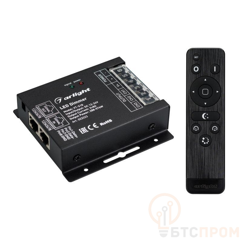 3-канальный диммер с радиопультом 12 кнопок. Питание 12-24VDC, макс.ток 3х8A, максимальная мощность 288-576W. Габариты диммера 91x88x24 мм, габариты пульта 150х40х20 мм.