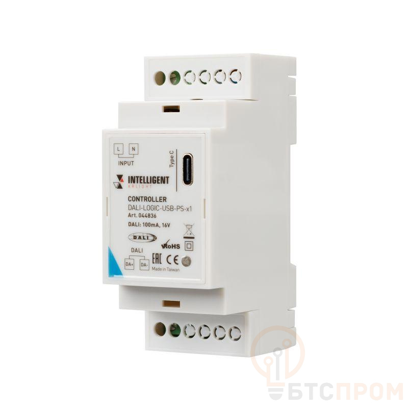 Контроллер DALI для управления и настройки линии DALI на 64 адреса. Управление и настройка с компьютера через USB. Полная поддержка DALI-2. Питание контроллера от сети 230В. Контроллер обеспечивает питание на шине DALI, 16В@100mA, отключаемый блок питания. Монтаж на DIN-рейку. Габариты контроллера 88х36х60 мм