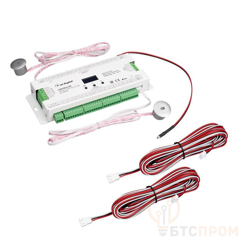 Контроллер для подсветки ступеней лестниц. Питание DC 5-24V, 32 выходных ШИМ канала для одноцветных лент, ток нагрузки 32х1А. Две группы цифровых выходов SPI (TTL) для SPI RGB ленты, всего 2х960 пикселей. Поддерживает управление до 32 ступеней. OLED дисплей и кнопки управления на корпусе. Расстояние срабатывания датчиков до 3м, диаметр отверстия под датчики 20 мм. Угол 120 градусов. Габариты 186х86х25.5 мм.
