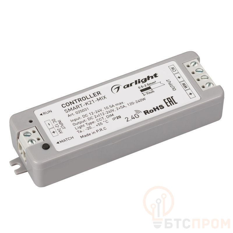 Контроллер для светодиодной MIX ленты (ШИМ). Питание/рабочее напряжение 12-24VDC, максимальный ток 5A на канал, 2 канала, максимальная мощность 120-240W. Винтовые клеммы. Корпус - PVC. Габариты 97x33x18 мм. Управляется пультами и панелями серии SMART (поставляются отдельно).